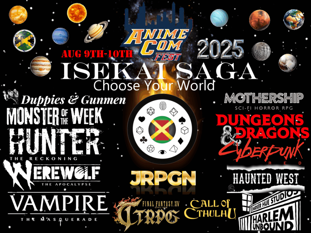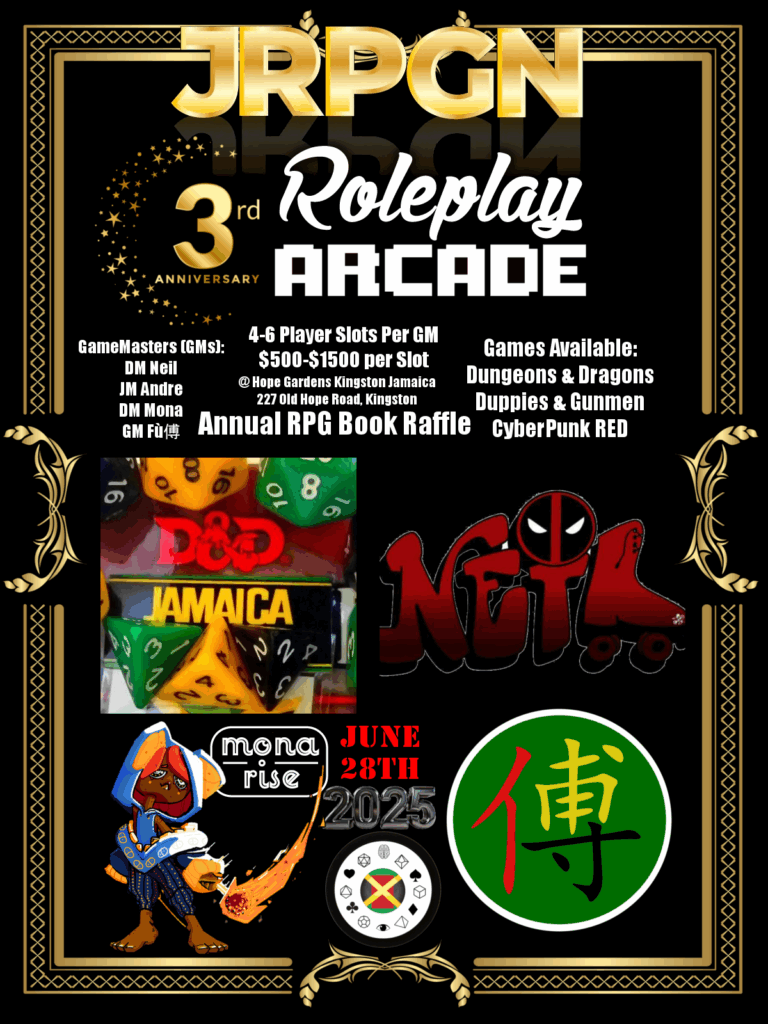 Events A Partnership Come True See us There Buy Ticket Aug 9th-10th JRPGN@AnimeConFest 100% RPG Raffle Winners! x2 Attend June 27th 2026 Anniversary 10% 2025 D&D/CyberPunk 100% International GM Day GM RPG Raffle Winners! x1 GM with JRPGN GM Day March 4 2026 CountDown 52.3% RPG Event Come Hang out and Play RPGs with some of Jamaica's most Creative Game Masters Buy Ticket